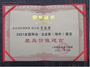 2021年3月,燕达国际健康城副总裁李海燕荣获“2021全国两会·企业家(场外)建言最具价值建言”,燕达养护中心荣获“2021全国两会· 推动行业发展突出贡献奖”。