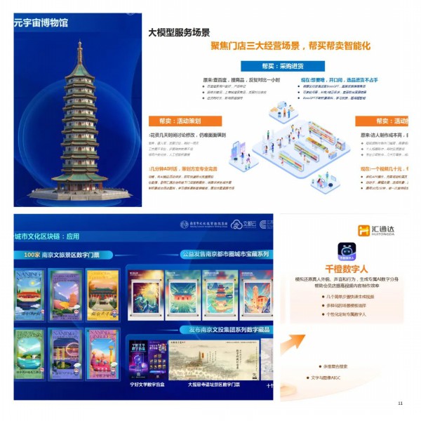 场景概述:打造数字时代城市文化整体解决方案南京文都数字云平台,包括基础层、打样层、放大层、产出层四层架构体系。研发文都大数据、文都区块链、文都大模型、文都元宇宙等四大技术平台及博物馆智能馆长,上线文都智脑媒体矩阵,落地“文学之都数字客厅”“数字文化客厅”等模块,形成数字文化新基建、新场馆、新体验和新平台等解决方案,塑造数字文化新生态。