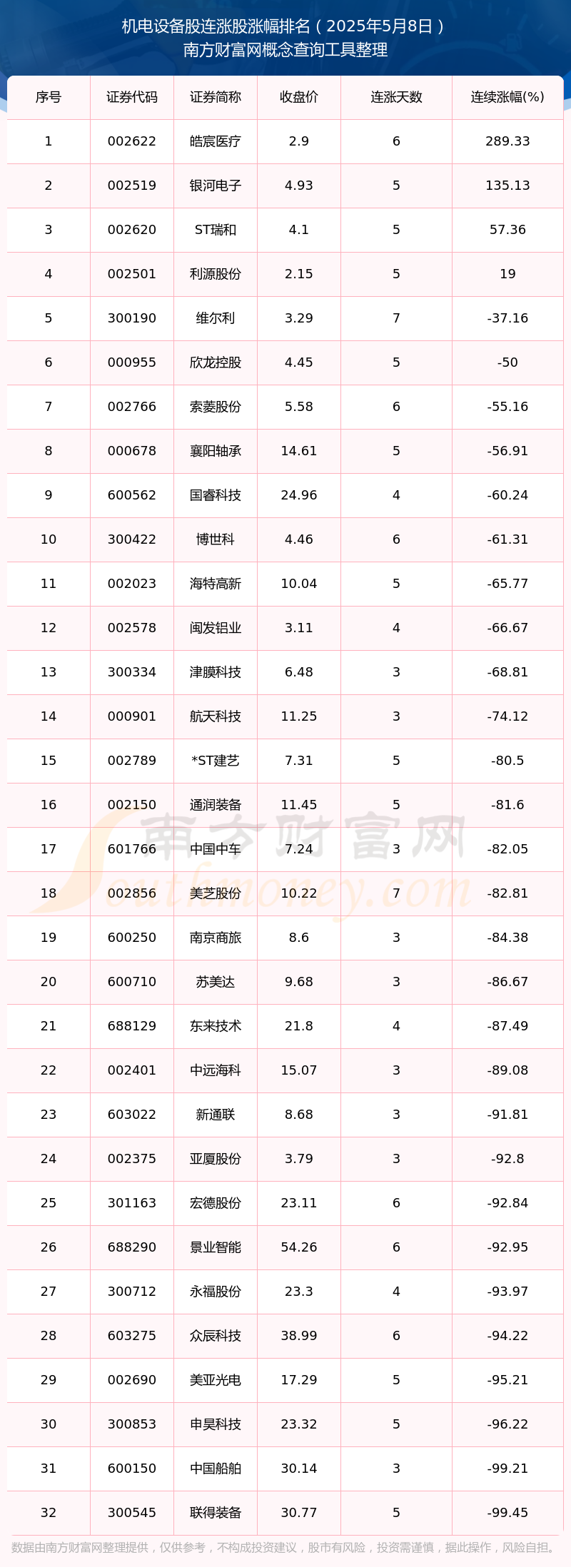 根据南方财富网概念查询工具数据统计,截止2025年5月8日收盘,机电设备股共有32只个股实现连涨。其中连续涨幅较大的个股有皓宸医疗、银河电子、ST瑞和等,连续涨幅分别为289.33%、135.13%、57.36%。