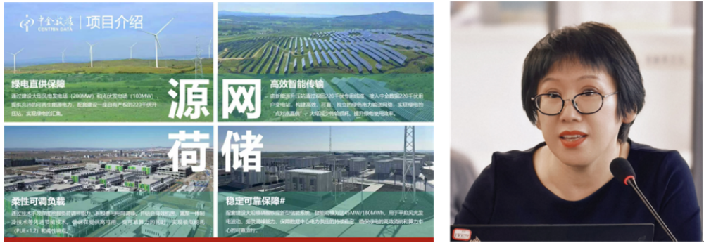 中金数据集团有限公司副总裁王薇薇以“绿电赋能算力 擘画零碳未来中金数据算电协同之路”为题,重点介绍了中金数据乌兰察布零碳算力产业基地——数据中心领域首个“源网荷储”一体化标杆项目。在“源”方面,中金数据通过建设大型风电发电场(200MW)和光伏发电场(100MW)提供充沛的可再生能源电力,配套建设一座自有产权的220千伏升压站,实现绿电的汇集。在“网”方面,由新能源升压站通过双回220千伏专用线千伏用户变电站,构建高效、可靠、独立的绿色电力输送网络,实现绿电的“点对点直供”,大幅减少传输损耗,提升绿电使用效率。在“荷”方面,通过技术手段挖掘负荷调节能力,积极参与电网调峰,并结合高效机房、氟泵一体制冷等先进节能技术,确保在提供高可用、高可靠算力的同时,实现极低能耗(PUE1.2)和柔性响应。在“储”方面,配套建设大规模磷酸铁锂新型储能系统,储能规模为达45MW/180MWh,用于平抑风光发电波动、提供调峰能力、保障数据中心电力供应的持续稳定,确保绿电的高效消纳和算力中心的可靠运行。