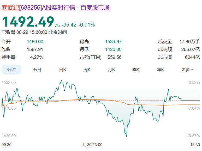 8月29日,A股半导体、算力、光刻机等科技板块跌幅居前,寒武纪大跌6%,跌破1500元关口,但仍保住了第一高价股地位。