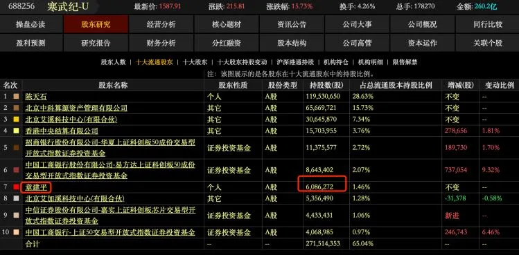 寒武纪前不久刚刚披露的中报显示,截至6月30日,章建平持有寒武纪608.63万股,较一季度没有变化。